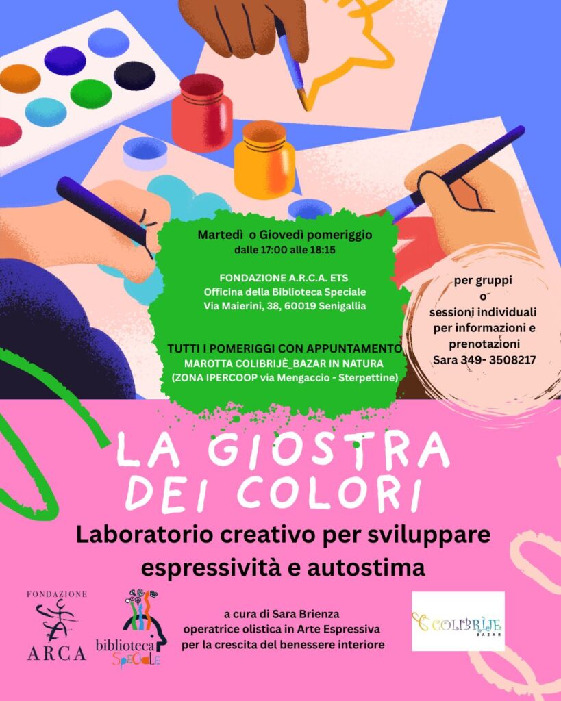 L’esperienza, guidata da Sara Brienza, operatrice olistica in Arte Espressiva, si svolge a Senigallia, Ancona, presso la Fondazione A.R.C.A. ETS – Officina della Biblioteca Speciale, il martedì o il giovedì pomeriggio, dalle 18:00 alle 19:15, e a Marotta, Pesaro e Urbino, presso Colibrije_Bazar in Natura, tutti i pomeriggi su appuntamento.