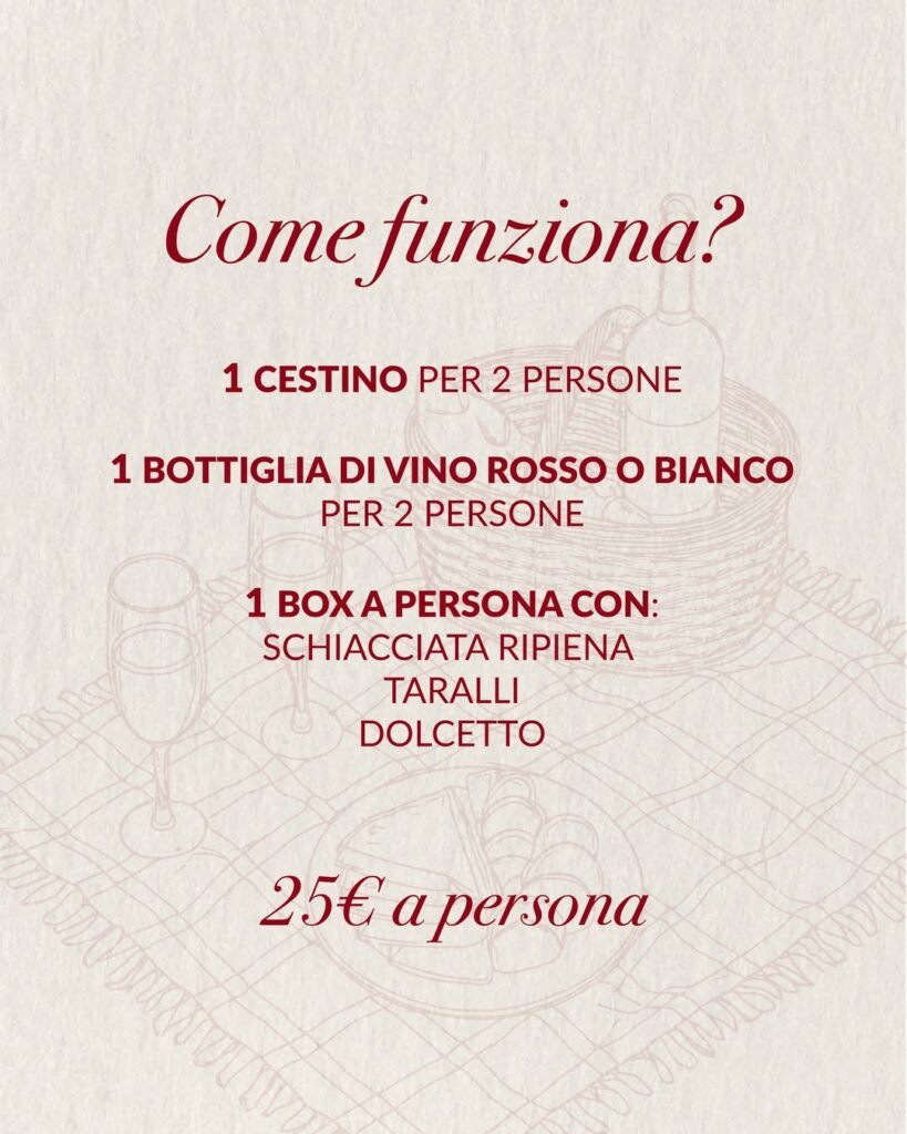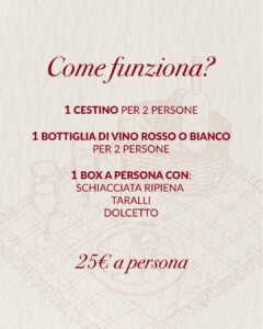 L’esperienza prevede l’organizzazione di un picnic all’aperto, con cestini di cibo e bevande forniti direttamente dalla fattoria.