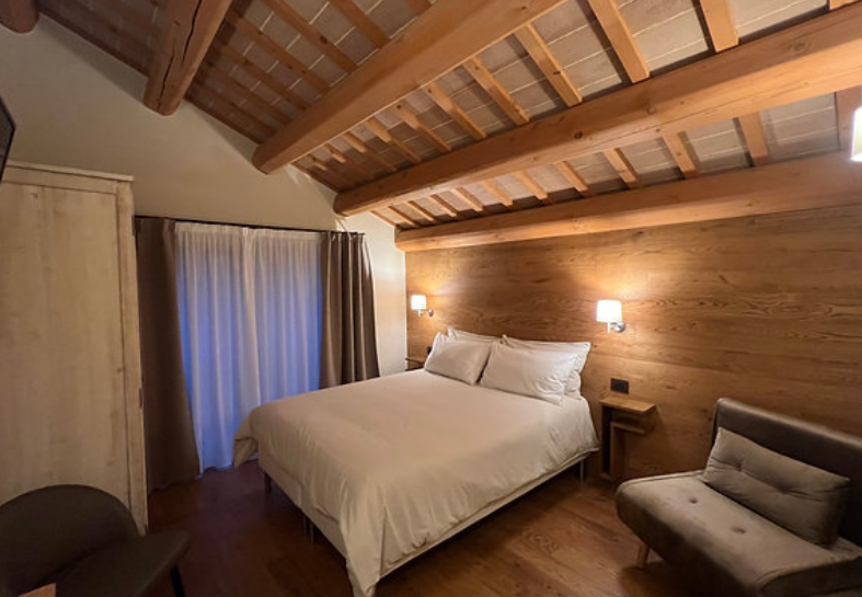 Le camere, dotate di colazione inclusa, sono pensate per garantire comfort e tranquillità, con affacci sul giardino, sulle montagne o sul cortile interno.
