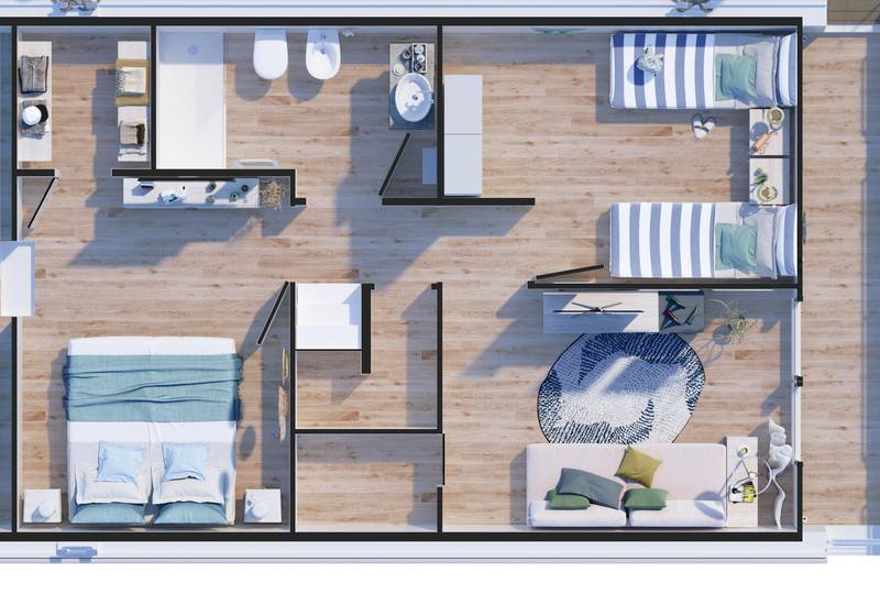 Tutte le sistemazioni si sviluppano su due livelli (circa 65 m²) e possono ospitare fino a sei persone, con spazi ben organizzati: