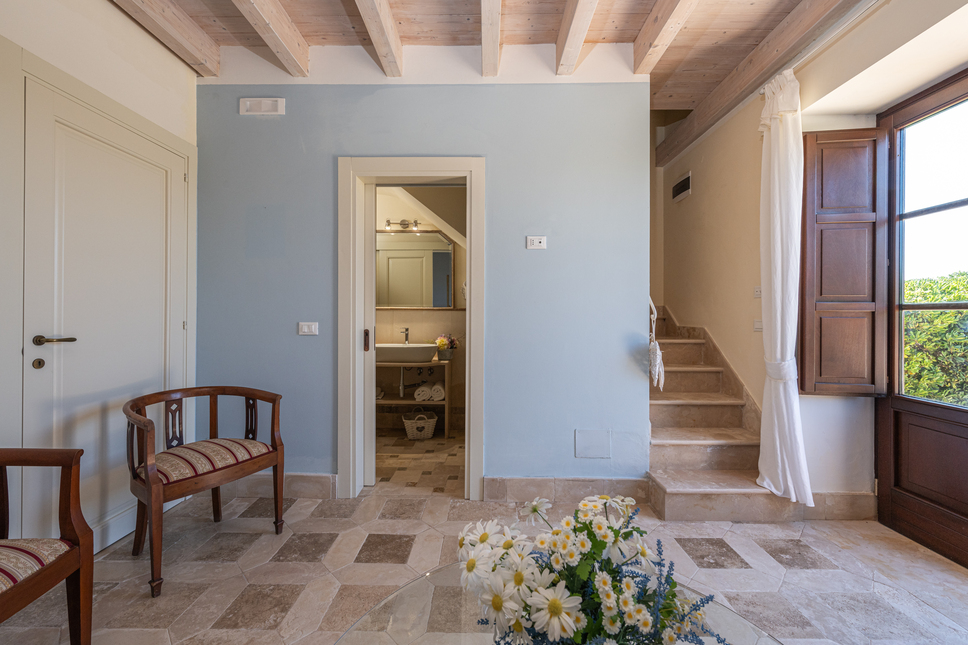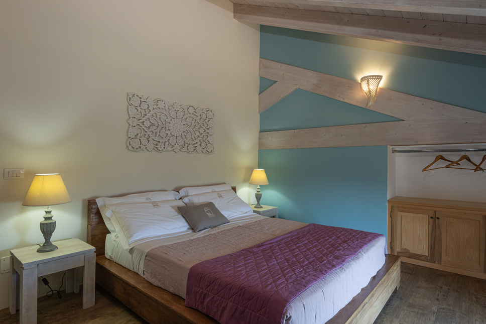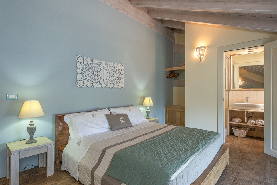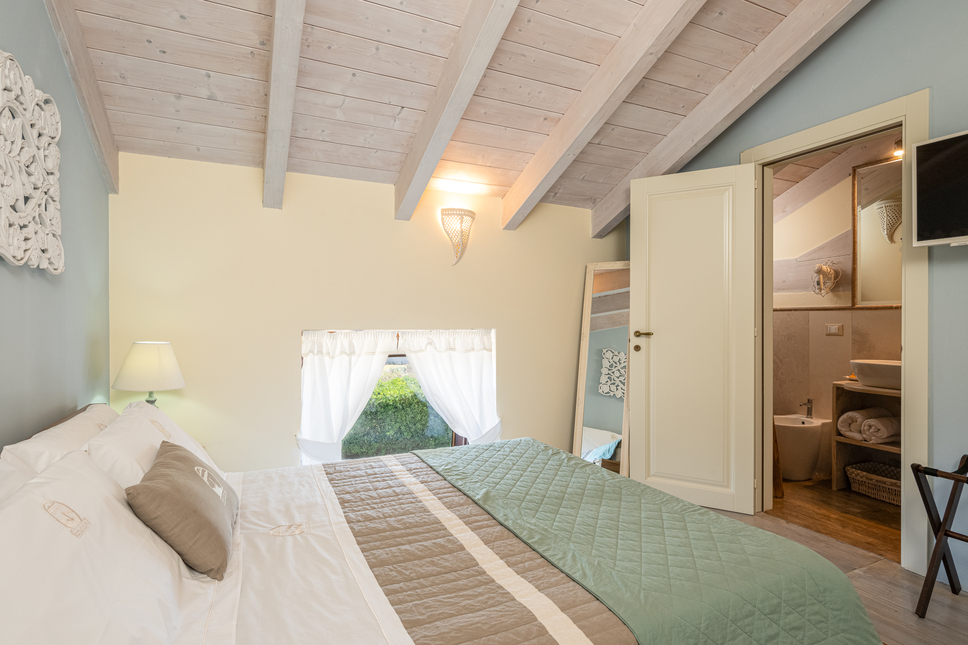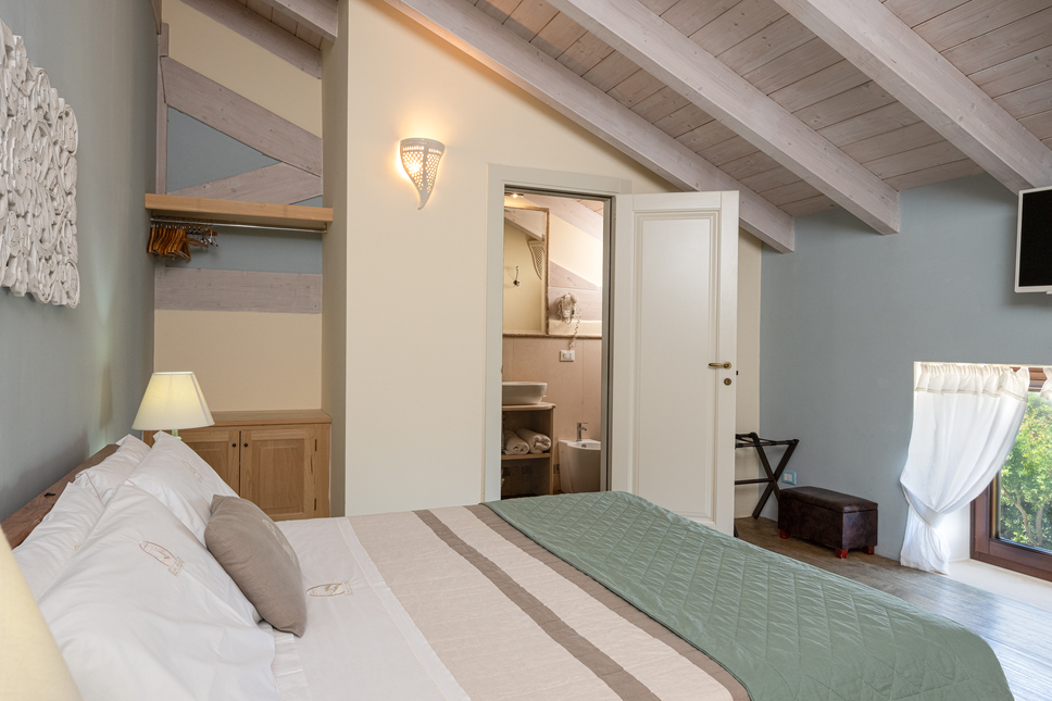 Dispone di 13 camere suddivise in diverse tipologie — Classic, Suite, Family — pensate per ospitare sia coppie che famiglie. Le sistemazioni, alcune sviluppate su due livelli, sono dotate di patio privato e affacci su paesaggi naturali o scorci simbolici della zona, come la Torre del Serpe e la baia sottostante.